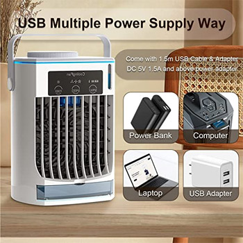Equipped with USB cable and adapter. The air cooler adopting double ultrasonic atomizer and wet curtain triple refrigeration, is able to reduce the surrounding temperature and cool the hot air around you within seconds.The personal air conditioner project cool and refreshing airflow, make you stay away from the hot summer!